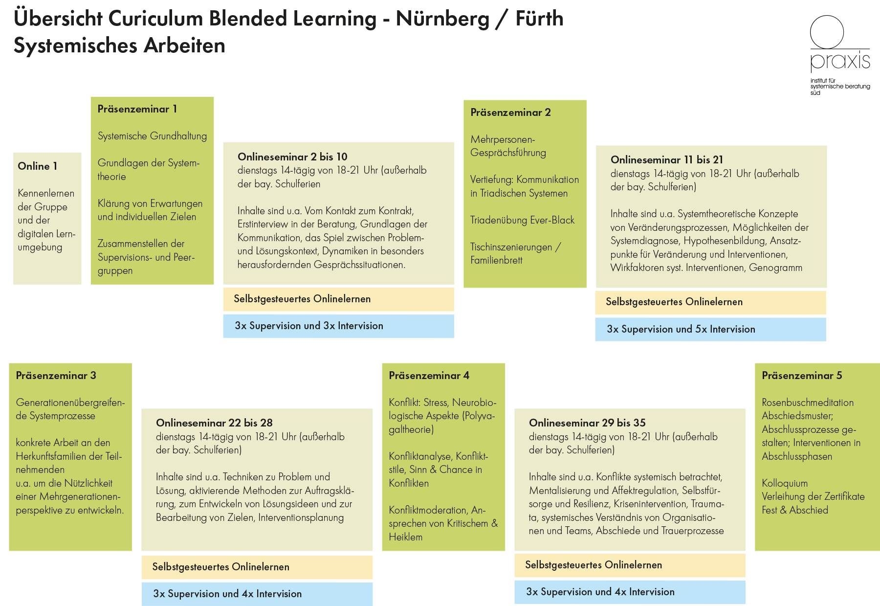 - sieben Präsenzseminare (je 4 - 5 Tage)